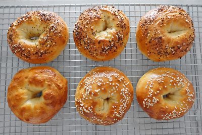 Hacemos 4 bolitas que rodamos con la palma de la mano sobre la encimera para convertirlas en bastoncillos alargados que uniremos para formar los bagels. Precalentamos la freidora a 130º, y mientras con un pincel pintamos las roscas con huevo batido y espolvoreamos por encima la cobertura que hayamos elegido. Colocamos los bagels en la cesta y horneamos durante 15 minutos, o hasta que estén doradas. Aunque nos pueda la impaciencia, es mejor dejarlos enfriar unos 15 minutos antes de cortar y rellenar.