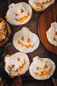 Mientras tanto, coge 4 de las tortillas de maíz y aprovecha para recortar las “caras de calabaza de Halloween” que prefieras (también conocidas en EE.UU como Jack-o’-Lantern). Coloca tus lonchas de queso cheddar en ese lado de la tortilla cubriendo los agujeros y mete cada una de ellas 10 segundos al microondas.